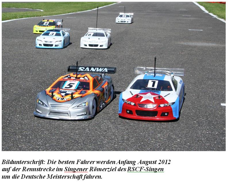 07.08.2012 Kleine Flitzer ganz groß Umweltfreundliches Elektro Motorsport Event gastierte unterm Hohentwiel. Strahlende Sieger, zuversichtliche Fahrer und ein zufriedenes Publikum sind das erste Resümee der Deutschen Meisterschaft der Elektro Minicars, die der RCSF-Singen e.V. im Singener Römerziel durchführte. Vom 4.-5. August waren knapp 60 Fahrer samt Technikern und Familien zu Gast in Singen. Durch engagierte Mitglieder und viel ehrenamtlichen Einsatz ist es dem Verein aus Singen gelungen, die Besucher für den Elektrorennsport zu begeistern, und den Fahrern aus ganz Deutschland ein einzigartiges und professionelles Ambiente zu bieten. Das quittierten dem Verein die Eröffnungsredner von Michael Enders vom RCSF, der sich bei den Mitgliedern, den Sponsoren und der Stadt Singen bedankte, und auch OB Oliver Ehret und der Vorsitzende Sportausschusses Roland Brecht unterstrichen die Leistungen Singener Vereins. Stolz ist der Verein auf die Gesamtbilanz. Insgesamt 6 Fahrer konnte der RCSF-Singen ins Rennen schicken. Angeführt wird das clubinterne Starterfeld von Markus Wegmann, der bei den Besten aus Deutschland einen guten 5. Platz belegte. Ebenfalls vom RCSF-Singen sind Fabian Bucher, Dirk Endres und Thomas Wegmann in der Modified-Klasse unter die besten 25 aus Deutschland gefahren. Neuer deutscher Meister in der ferngesteuerten Königsklasse Modified ist Ronald Völker vom MBC Goldstein e.V. bei Frankfurt. In der Sportklasse konnte sich Tobias Vogel vom MCG Strohgäu e.V. bei Stuttgart des deutschen Meisters sichern. Philipp Walleser vom RCSF Singen belegte einen 8. Platz und wurde 4. Jugendmeister. In der Hobbyklasse sicherte sich Tim Kohmann vom 1. MBC Bamberg e.V. den Meistertitel und Pius Walleser vom RCSF Singen fuhr auf den 5 Platz in der Gesamtwertung und wurde Zweiter in der 40+ Altersklasse. Auf diese Platzierungen kann der Verein mit Recht stolz sein. Die Region und die Stadt Singen wurden würdig vertreten. Mit Spannung blickt der Verein in die Zukunft. ##### |