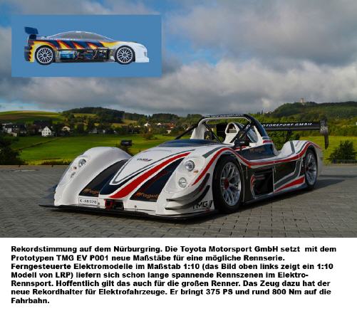 31. August 2011 HOCHSPANNUNG (END) Mit dem elektrisch angetriebenen Fahrzeug TMG EV P001 setzt die Toyota Motorsport GmbH zukunftsweisende Maßstäbe für umweltfreundlichen Rennsport. Die Investition in neue Technologien bescherte den Entwicklern am 29. August einen neuen Rundenrekord auf dem Nürburgring und setzt somit deutliche Zeichen für eine Rennserie, die den Motorsport bereichert und vor allem für alternative Technologien bei der automobilen Serienproduktion. Am Steuer des Elektroboliden schaffte der Nordschleifen-Spezialist Jochen Krumbach am 29,. August 2011 eine Rundenzeit von unter 8 Minuten. Mit diesem Rekordergebnis liegt die Toyota Motorsport GmbH (TMG ) somit rund 1 Minute unter dem bisherigen Rekord und setzt neue Maßstäbe. Die 20,8 Kilometer lange Eifelstrecke wurde in Sieben Minuten und 47,794 Sekunden gefahren. Mit einer Durchschnittsgeschwindigkeit von rund 160 km/h zeigt die Toyota Motorsport GmbH, dass man durchaus auch im Motorsport auf Elektroantrieb zurückgreifen kann. Was bislang nur den funkferngesteuerten Elektromodellen vorbehalten war zieht nun seine Bahnen in dem maßstabsgetreuen Motorsport. Denn auch bei den RC-Elektromodellen gibt es viele Rennserien, bei denen Geschwindigkeit und Adrenalin im Vordergrund stehen. Während bei den Verbrennungsmotoren zuerst die Rennfahrzeuge der DTM für die kleinen Renner Pate standen, sind die kleinen ferngesteuerten Elektroflitzer schon Platzhirsche. Aber die technischen Möglichkeiten der Leistungsbereitstellung und -ausbeute liegen größen- und gewichtsbedingt weit auseinander. Interessant bei den Elektrofahrzeugen beider Couleur ist die Geräuschemission, die aufgrund des dezenten Pianissimo eher an eine sanfte Meldoie erinnert wobei die Leistung dem Fortissimo eines klassischen Verbrennermotors wenig nachsteht. Eine beeindruckende Komposition von geringer Lautstärke und gigantischem Leistungsausmaß. Somit geht imense Leistung und Geschwindigkleit nicht einher mit ohrenbetäubendem Lärm der mehrzylindrigen Verbrennungsmotoren. Daran muss sich das Motorsportohr erst noch gewöhnen – was aber der Faszination Rennsport keinen Abbruch tut. Befeuert wird der TMG EV P001 von zwei Elektromotoren, die gemeinsam das Fahrzeug mit einem Drehmoment von 800 Newtonmetern vorantreiben können. Mit dieser Kraft, die keinen Drehzahlkeller kennt, und sofort zur Verfügung steht, beschleunigt der Prototyp auf eine Höchstgeschwindigkeit von 260 km/h. Bereits nach 3,9 Sekunden wird die 100 km/h-Marke erreicht. Die Motoren leisten zusammen 280 kW/375 PS. Der Antrieb des Rennwagens bezieht die Energie aus einer Lithium-Ceramic-Batterie die mit einer Spannung von 520 Volt arbeitet und insgesamt 41,5 kWh speichert. Der Akku trägt 350 Kilogramm zu den 970 Kilogramm Gesamtgewicht des Rennwagens bei. Die Ladezeit des Aggregats beträgt rund 4 Stunden und bei normaler Fahrweise reicht dies für rund 300 Kilometer. Der offene Prototyp hat einen Radstand von 2.37 Metern bei einer Länge von 4,19 Metern. Er ist 1,79 Meter breit, aber nur 1,07 Meter hoch. Am Tag der Rekordfahrt war es trocken, allerdings bei niedriger Streckentemperatur. Die Nordschleife des Nürburgrings stellt für elektrisch betriebene Rennwagen mit ihren vielen Steigungen, dem hohen Vollgasanteil und den großen Höhenunterschieden eine besondere Herausforderung dar. Das diese Erfolge nur in einem kompetenten Team gestemmt werden, zeigt die zukunftsweisende Zusammenarbeit von TMG mit den Spezialisten der Firmen Aguti, Rational Motion und EVO Electric. Die Fahrleistungen des Elektrorennwagens und die erreichte Zeit unterstreichen aus Sicht von TMG, dass Motorsport auch mit elektrisch betriebenen Fahrzeugen nichts von seiner Faszination einbüßt. Der Antriebsstrang des Rekord-Prototyps ist für künftige Motorsportserien geeignet. TMG startet bereits im kommenden Jahr die kommerzielle Produktion des Antriebssystems. Dieses wird weiterentwickelt und auf verschiedene alternative Chassis-Lösungen angepasst. Es bleibt spannend, wie sich hier eine Rennserie entwickelt und Vorteile hat mit Sicherheit der normale Autofahrer. Die Faszination und die Medienpräsens des Rennsports verkürzt die Zeit, bis technische Innovationen umgesetzt werden. Denn: viele Errungenschaften aus dem Motorsport halten Einzug in die Serienfahrzeuge. ##### |